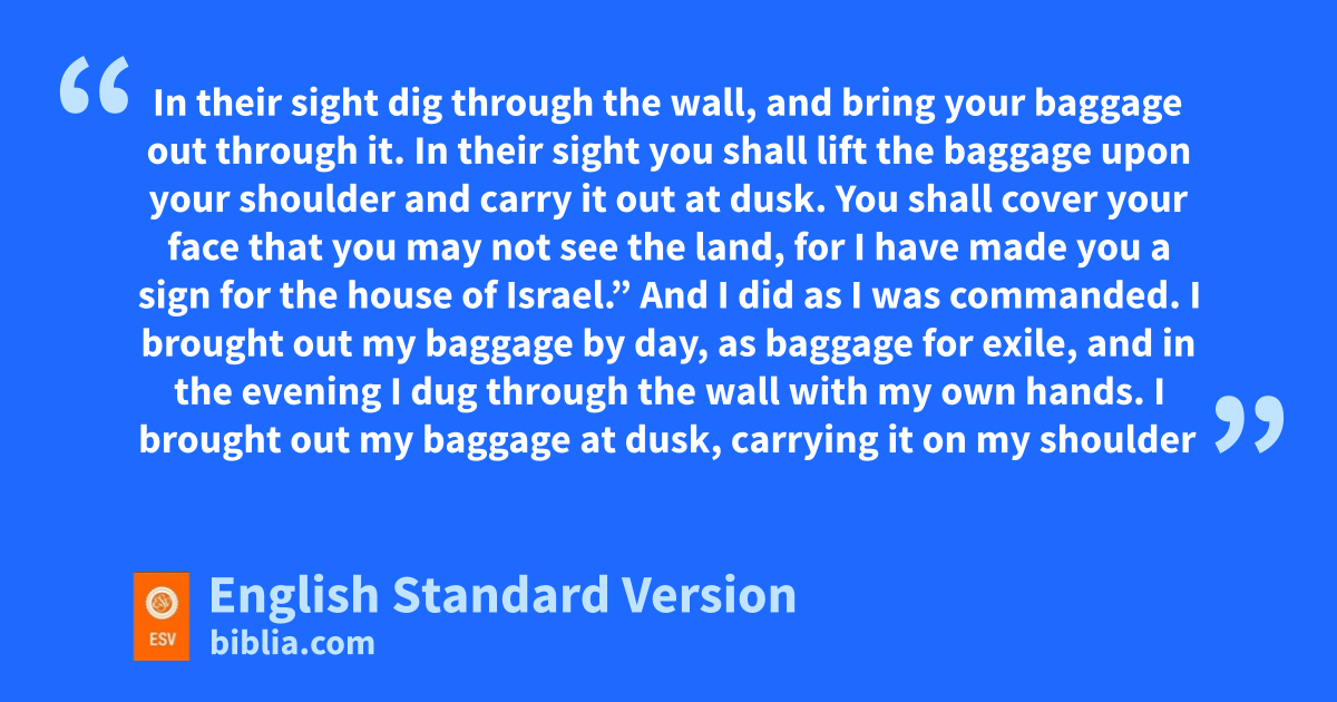 12 The word of the Lord came to me: 2 j“Son of man, you dwell in the midst of ka rebellious house, lwho have eyes to see, but see not, who have ears to hear, but hear not, for they are ka rebellious house. 3 As for you, son of man, prepare for yourself man exile’s baggage, and go into exile by day nin their sight. You shall go like an exile from your place to another place nin their sight. oPerhaps they will understand, though1 they are a rebellious house. 4 You shall bring out your baggage by day in their sight, as baggage for exile, and you shall go out yourself pat evening in their sight, as those do who must go into exile. 5 In their sight qdig through the wall, and bring your baggage out through it. 6 In their sight you shall lift the baggage upon your shoulder and carry it out at dusk. You shall cover your face that you may not see the land, for I have made you ra sign for the house of Israel.”