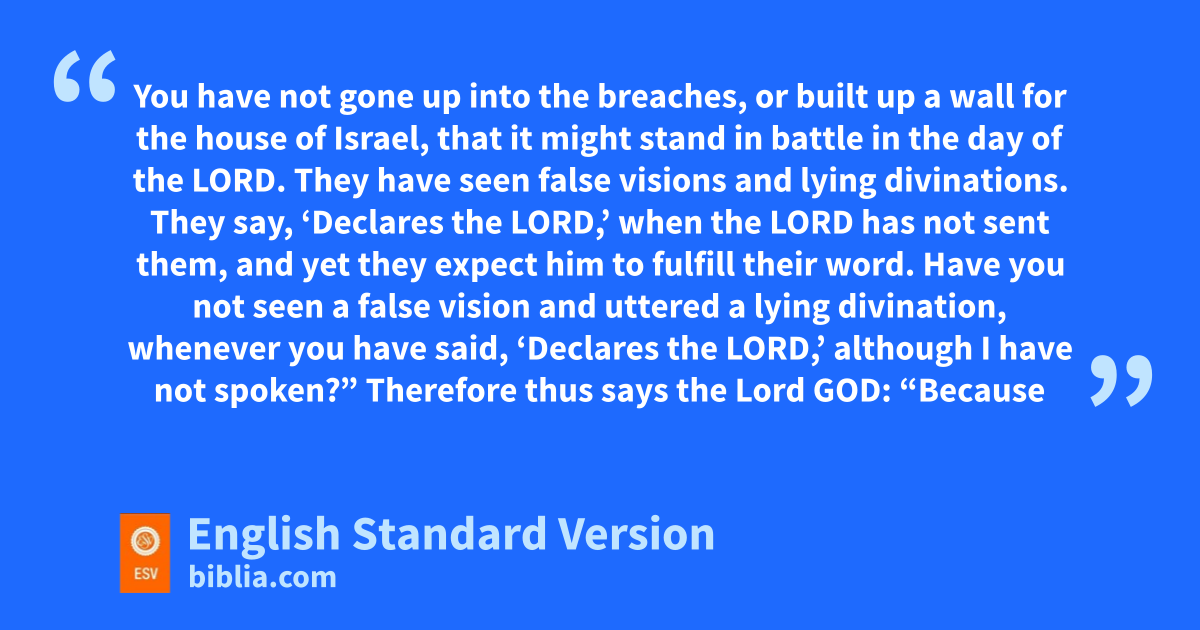13 The word of the Lord came to me: 2 a“Son of man, prophesy against the prophets of Israel, who are prophesying, and say to those bwho prophesy from their own hearts: ‘Hear the word of the Lord!’ 3 Thus says the Lord God, Woe to the foolish prophets who follow their own spirit, and have seen nothing! 4 Your prophets have been like jackals among ruins, O Israel. 5 cYou have not gone up into the breaches, or built up a wall for the house of Israel, that it might stand in battle in the day of the Lord. 6 dThey have seen false visions and lying divinations. They say, ‘Declares the Lord,’ ewhen the Lord has not sent them, and yet they expect him to fulfill their word. 7 Have you not seen a false vision and uttered a lying divination, fwhenever you have said, ‘Declares the Lord,’ although I have not spoken?”