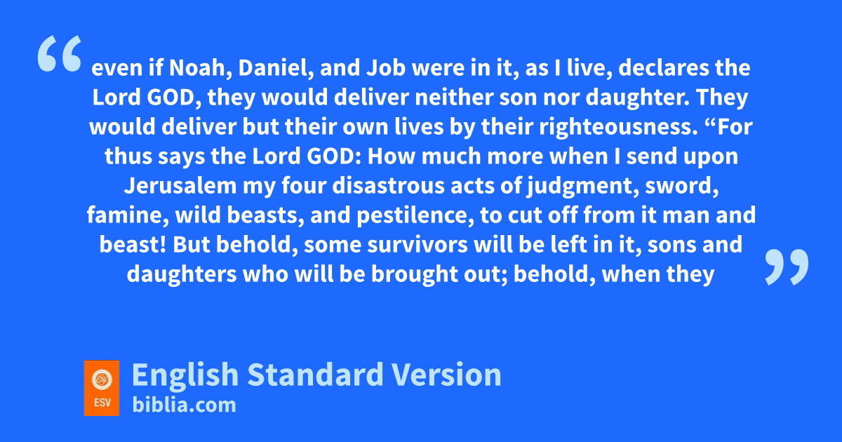 12 And the word of the Lord came to me: 13 t“Son of man, when a land sins against me uby acting faithlessly, and I stretch out my hand against it and vbreak its supply2 of bread and send famine upon it, and wcut off from it man and beast, 14 xeven if these three men, yNoah, zDaniel, and aJob, were in it, bthey would deliver but their own lives by their righteousness, declares the Lord God.
