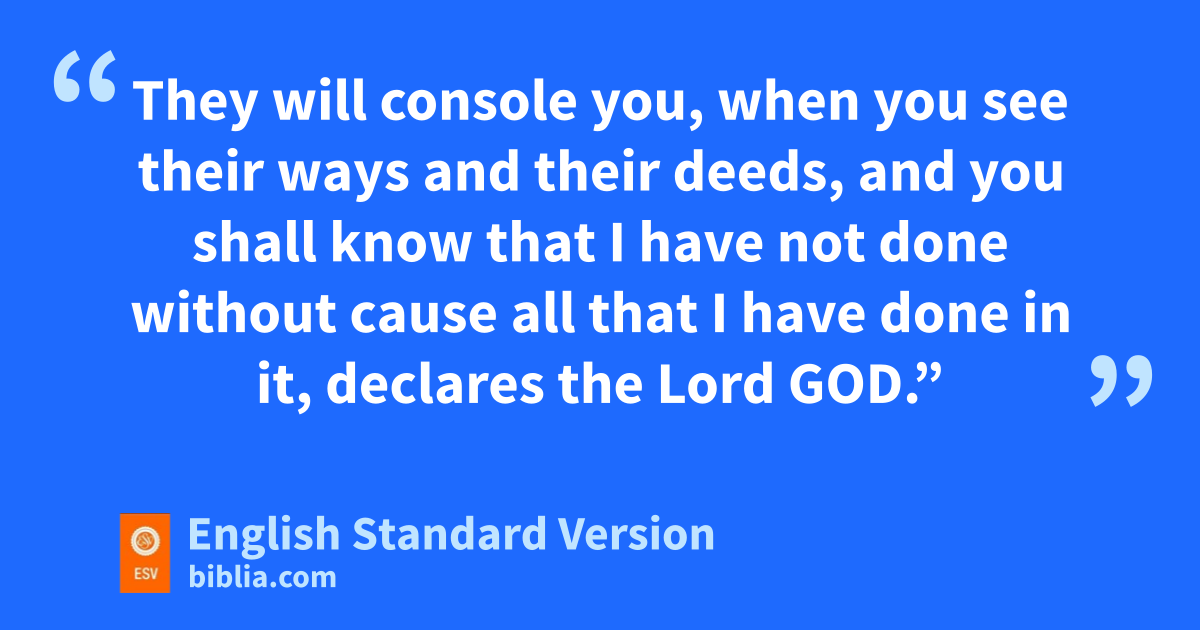 21 “For thus says the Lord God: How much more jwhen I send upon Jerusalem my four disastrous acts of judgment, ksword, lfamine, mwild beasts, and npestilence, to cut off from it man and beast! 22 But behold, osome survivors will be left in it, sons and daughters who will be brought out; behold, when they come out to you, and pyou see their ways and their deeds, you will be consoled for the disaster that I have brought upon Jerusalem, for all that I have brought upon it. 23 They will console you, when you see their ways and their deeds, and you shall know that I have not done without cause all that I have done in it, declares the Lord God.”