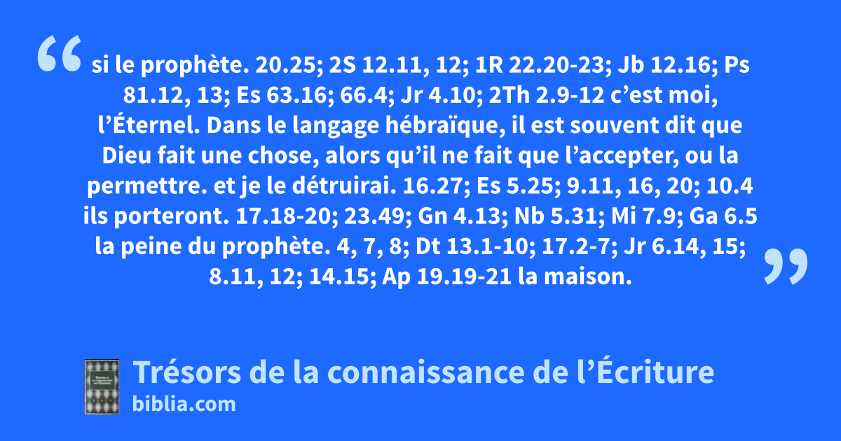 si le prophète. 20.25; 2S 12.11, 12; 1R 22.20-23; Jb 12.16; Ps 81.12, 13; Es 63.16; 66.4; Jr 4.10; 2Th 2.9-12 c’est moi, l’Éternel. Dans le langage hébraïque, il est souvent dit que Dieu fait une chose, alors qu’il ne fait que l’accepter, ou la permettre. et je le détruirai. 16.27; Es 5.25; 9.11, 16, 20; 10.4