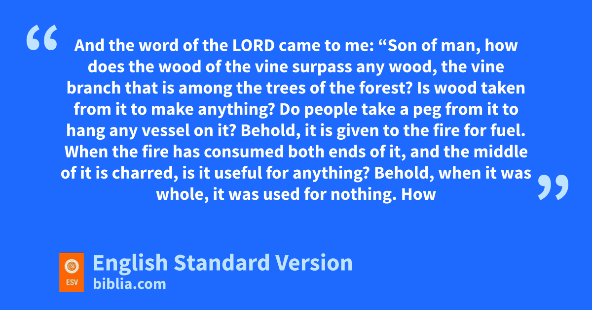 15 And the word of the Lord came to me: 2 q“Son of man, how does rthe wood of the vine surpass any wood, the vine branch that is among the trees of the forest? 3 Is wood taken from it to make anything? Do people take sa peg from it to hang any vessel on it? 4 tBehold, it is given to the fire for fuel. When the fire has consumed both ends of it, and the middle of it is charred, is it useful for anything? 5 uBehold, when it was whole, it was used for nothing. How much less, when the fire has consumed it and it is charred, can it ever be used for anything! 6 Therefore thus says the Lord God: vLike the wood of the vine among the trees of the forest, twhich I have given to the fire for fuel, so have I given up the inhabitants of Jerusalem. 7 wAnd I will set my face against them. Though xthey escape from the fire, the fire shall yet consume them, yand you will know that I am the Lord, wwhen I set my face against them. 8 zAnd I will make the land desolate, because athey have acted faithlessly, declares the Lord God.”