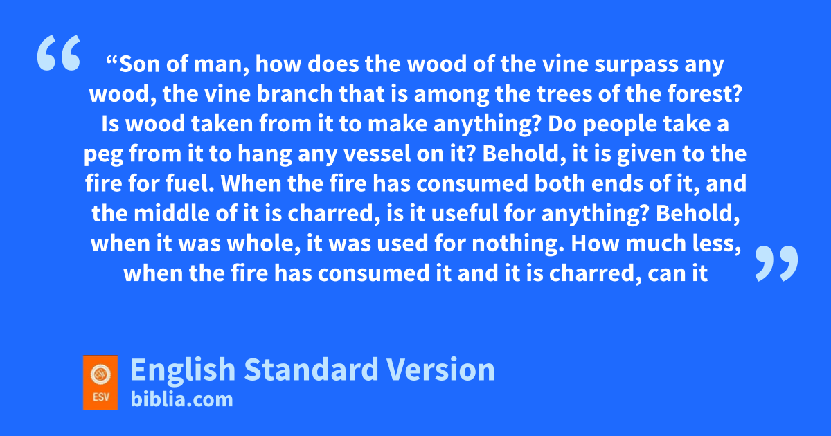 15 And the word of the Lord came to me: 2 q“Son of man, how does rthe wood of the vine surpass any wood, the vine branch that is among the trees of the forest? 3 Is wood taken from it to make anything? Do people take sa peg from it to hang any vessel on it? 4 tBehold, it is given to the fire for fuel. When the fire has consumed both ends of it, and the middle of it is charred, is it useful for anything? 5 uBehold, when it was whole, it was used for nothing. How much less, when the fire has consumed it and it is charred, can it ever be used for anything! 6 Therefore thus says the Lord God: vLike the wood of the vine among the trees of the forest, twhich I have given to the fire for fuel, so have I given up the inhabitants of Jerusalem. 7 wAnd I will set my face against them. Though xthey escape from the fire, the fire shall yet consume them, yand you will know that I am the Lord, wwhen I set my face against them. 8 zAnd I will make the land desolate, because athey have acted faithlessly, declares the Lord God.”