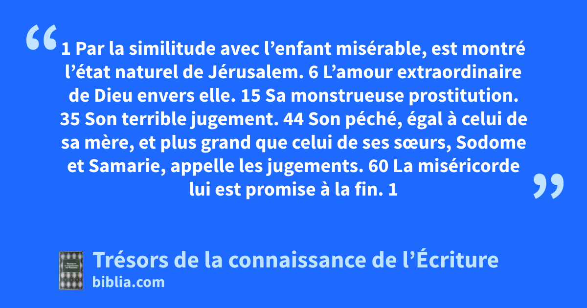 1 Par la similitude avec l’enfant misérable, est montré l’état naturel de Jérusalem. 6 L’amour extraordinaire de Dieu envers elle. 15 Sa monstrueuse prostitution. 35 Son terrible jugement. 44 Son péché, égal à celui de sa mère, et plus grand que celui de ses sœurs, Sodome et Samarie, appelle les jugements. 60 La miséricorde lui est promise à la fin.