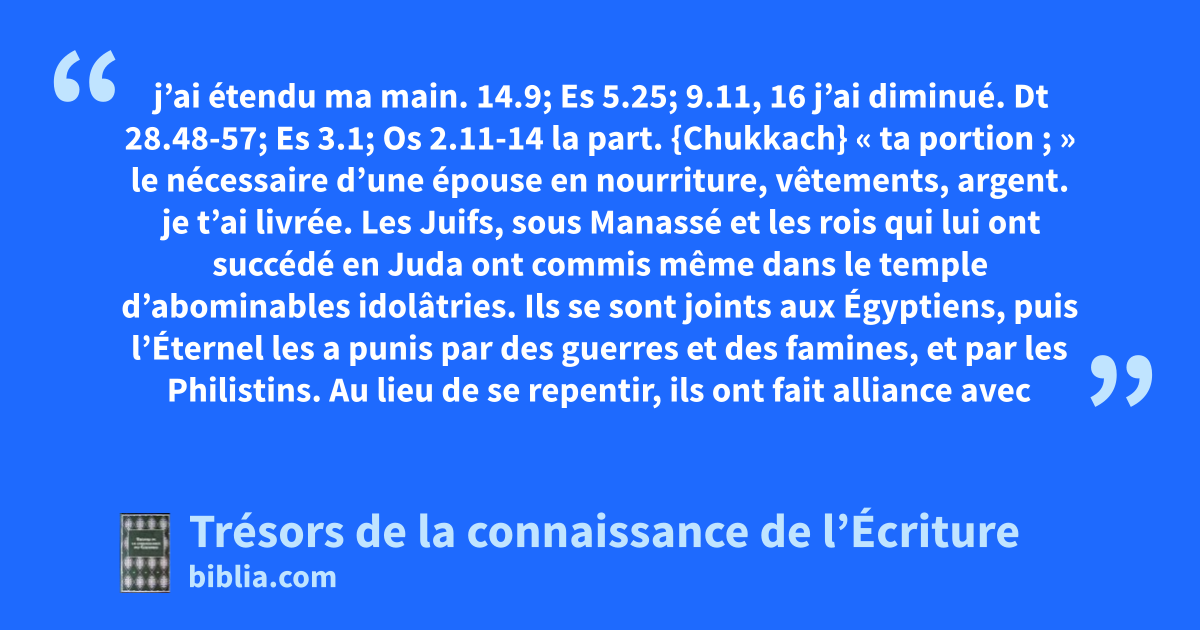 j’ai étendu ma main. 14.9; Es 5.25; 9.11, 16 j’ai diminué. Dt 28.48-57; Es 3.1; Os 2.11-14 la part. {Chukkach} « ta portion ; » le nécessaire d’une épouse en nourriture, vêtements, argent. je t’ai livrée. Les Juifs, sous Manassé et les rois qui lui ont succédé en Juda ont commis même dans le temple d’abominables idolâtries. Ils se sont joints aux Égyptiens, puis l’Éternel les a punis par des guerres et des famines, et par les Philistins. Au lieu de se repentir, ils ont fait alliance avec les Assyriens et ont adoré leurs dieux. 37; 23.22, 25, 28, 29, 46, 47; Ps 106.41; Jr 34.21; Ap 17.16 les filles. Ou : les villes. 2R 24.2; 2Ch 28.18, 19; Es 9.11 qui ont rougi. 47, 57; 5.6, 7