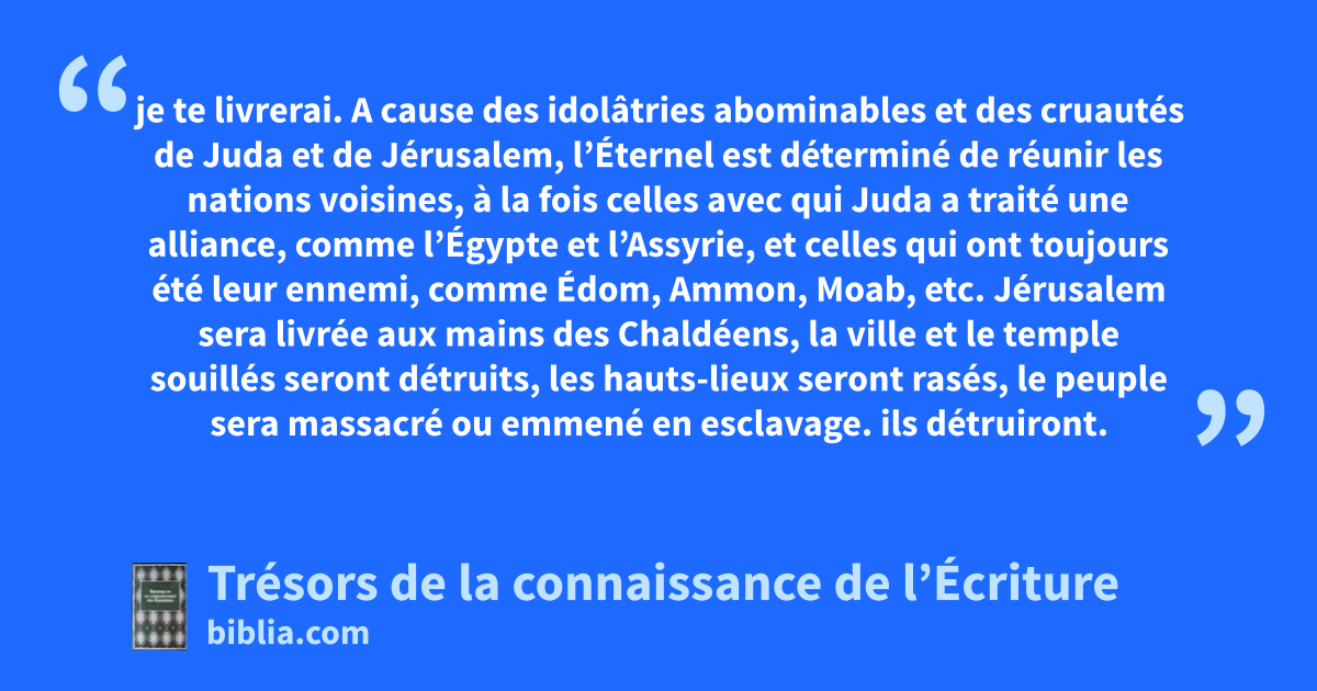 je te livrerai. A cause des idolâtries abominables et des cruautés de Juda et de Jérusalem, l’Éternel est déterminé de réunir les nations voisines, à la fois celles avec qui Juda a traité une alliance, comme l’Égypte et l’Assyrie, et celles qui ont toujours été leur ennemi, comme Édom, Ammon, Moab, etc. Jérusalem sera livrée aux mains des Chaldéens, la ville et le temple souillés seront détruits, les hauts-lieux seront rasés, le peuple sera massacré ou emmené en esclavage. ils détruiront. 24, 25, 31; 7.22-24; Es 27.9 ils te dépouilleront. 10-20; 23.26, 29; Es 3.16-24; Os 2.5, 11-15