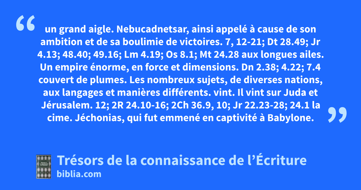 un grand aigle. Nebucadnetsar, ainsi appelé à cause de son ambition et de sa boulimie de victoires. 7, 12-21; Dt 28.49; Jr 4.13; 48.40; 49.16; Lm 4.19; Os 8.1; Mt 24.28 aux longues ailes. Un empire énorme, en force et dimensions. Dn 2.38; 4.22; 7.4 couvert de plumes. Les nombreux sujets, de diverses nations, aux langages et manières différents. vint. Il vint sur Juda et Jérusalem. 12; 2R 24.10-16; 2Ch 36.9, 10; Jr 22.23-28; 24.1 la cime. Jéchonias, qui fut emmené en captivité à Babylone. d’un cèdre. La famille royale et ancienne de David.