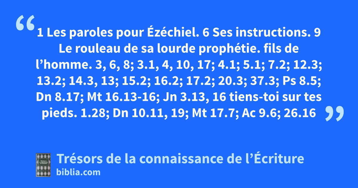 fils de l’homme. 3, 6, 8; 3.1, 4, 10, 17; 4.1; 5.1; 7.2; 12.3; 13.2; 14.3, 13; 15.2; 16.2; 17.2; 20.3; 37.3; Ps 8.5; Dn 8.17; Mt 16.13-16; Jn 3.13, 16 tiens-toi sur tes pieds. 1.28; Dn 10.11, 19; Mt 17.7; Ac 9.6; 26.16
