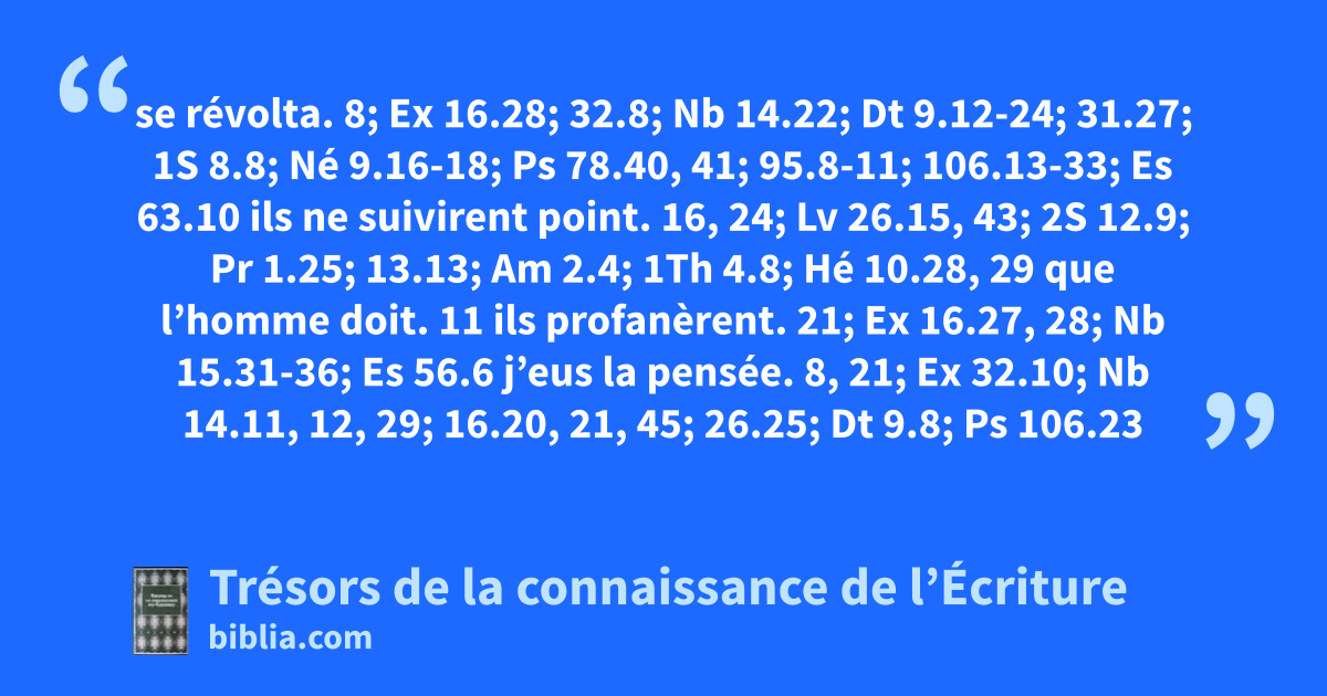 se révolta. 8; Ex 16.28; 32.8; Nb 14.22; Dt 9.12-24; 31.27; 1S 8.8; Né 9.16-18; Ps 78.40, 41; 95.8-11; 106.13-33; Es 63.10 ils ne suivirent point. 16, 24; Lv 26.15, 43; 2S 12.9; Pr 1.25; 13.13; Am 2.4; 1Th 4.8; Hé 10.28, 29 que l’homme doit. 11 ils profanèrent. 21; Ex 16.27, 28; Nb 15.31-36; Es 56.6 j’eus la pensée. 8, 21; Ex 32.10; Nb 14.11, 12, 29; 16.20, 21, 45; 26.25; Dt 9.8; Ps 106.23