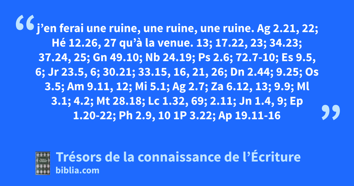 j’en ferai une ruine, une ruine, une ruine. Ag 2.21, 22; Hé 12.26, 27 qu’à la venue. 13; 17.22, 23; 34.23; 37.24, 25; Gn 49.10; Nb 24.19; Ps 2.6; 72.7-10; Es 9.5, 6; Jr 23.5, 6; 30.21; 33.15, 16, 21, 26; Dn 2.44; 9.25; Os 3.5; Am 9.11, 12; Mi 5.1; Ag 2.7; Za 6.12, 13; 9.9; Ml 3.1; 4.2; Mt 28.18; Lc 1.32, 69; 2.11; Jn 1.4, 9; Ep 1.20-22; Ph 2.9, 10 1P 3.22; Ap 19.11-16