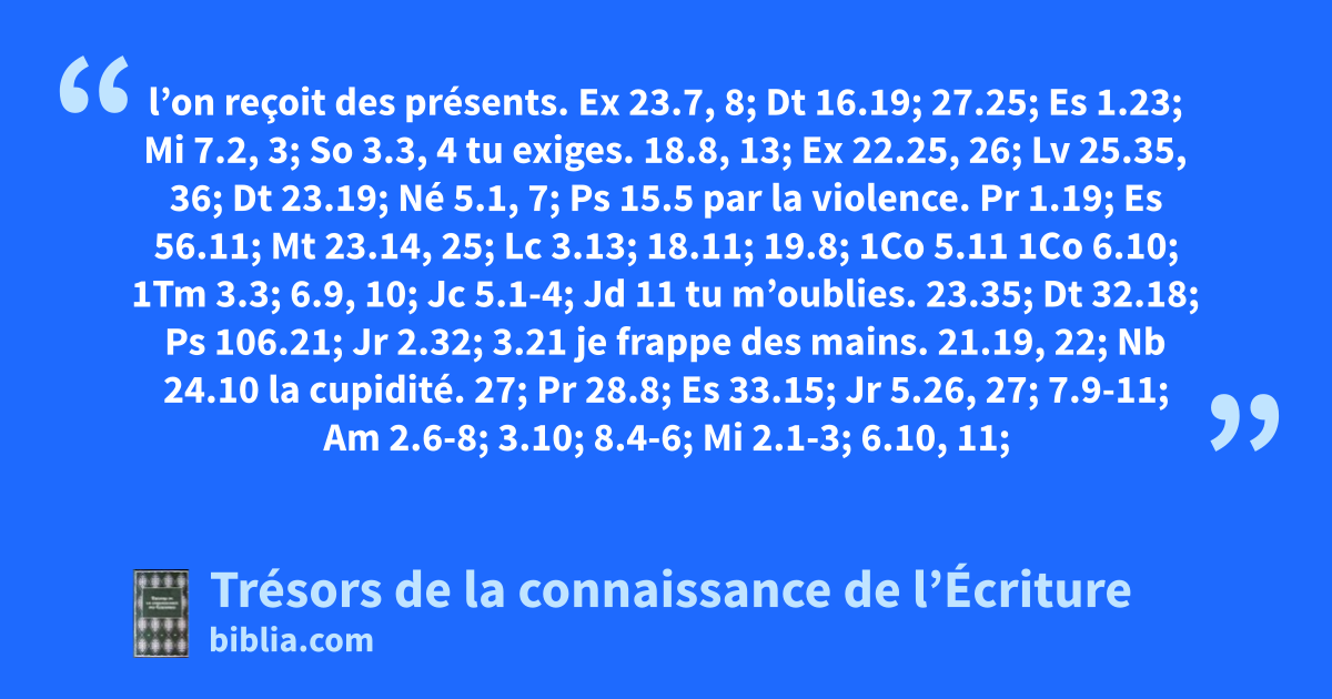 l’on reçoit des présents. Ex 23.7, 8; Dt 16.19; 27.25; Es 1.23; Mi 7.2, 3; So 3.3, 4 tu exiges. 18.8, 13; Ex 22.25, 26; Lv 25.35, 36; Dt 23.19; Né 5.1, 7; Ps 15.5 par la violence. Pr 1.19; Es 56.11; Mt 23.14, 25; Lc 3.13; 18.11; 19.8; 1Co 5.11 1Co 6.10; 1Tm 3.3; 6.9, 10; Jc 5.1-4; Jd 11 tu m’oublies. 23.35; Dt 32.18; Ps 106.21; Jr 2.32; 3.21