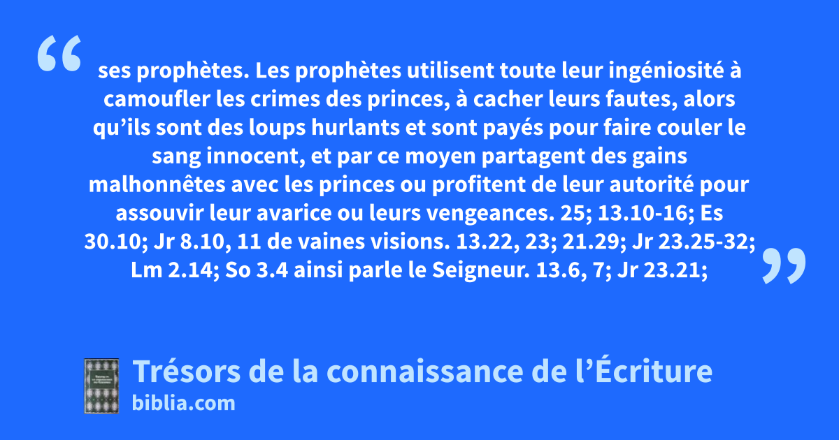 ses prophètes. Les prophètes utilisent toute leur ingéniosité à camoufler les crimes des princes, à cacher leurs fautes, alors qu’ils sont des loups hurlants et sont payés pour faire couler le sang innocent, et par ce moyen partagent des gains malhonnêtes avec les princes ou profitent de leur autorité pour assouvir leur avarice ou leurs vengeances. 25; 13.10-16; Es 30.10; Jr 8.10, 11 de vaines visions. 13.22, 23; 21.29; Jr 23.25-32; Lm 2.14; So 3.4 ainsi parle le Seigneur. 13.6, 7; Jr 23.21; 28.2, 15; 29.8, 9; 37.19