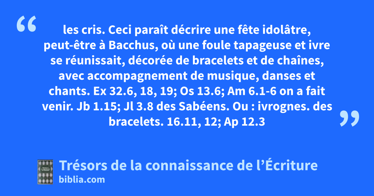 les cris. Ceci paraît décrire une fête idolâtre, peut-être à Bacchus, où une foule tapageuse et ivre se réunissait, décorée de bracelets et de chaînes, avec accompagnement de musique, danses et chants. Ex 32.6, 18, 19; Os 13.6; Am 6.1-6 on a fait venir. Jb 1.15; Jl 3.8 des Sabéens. Ou : ivrognes. des bracelets. 16.11, 12; Ap 12.3