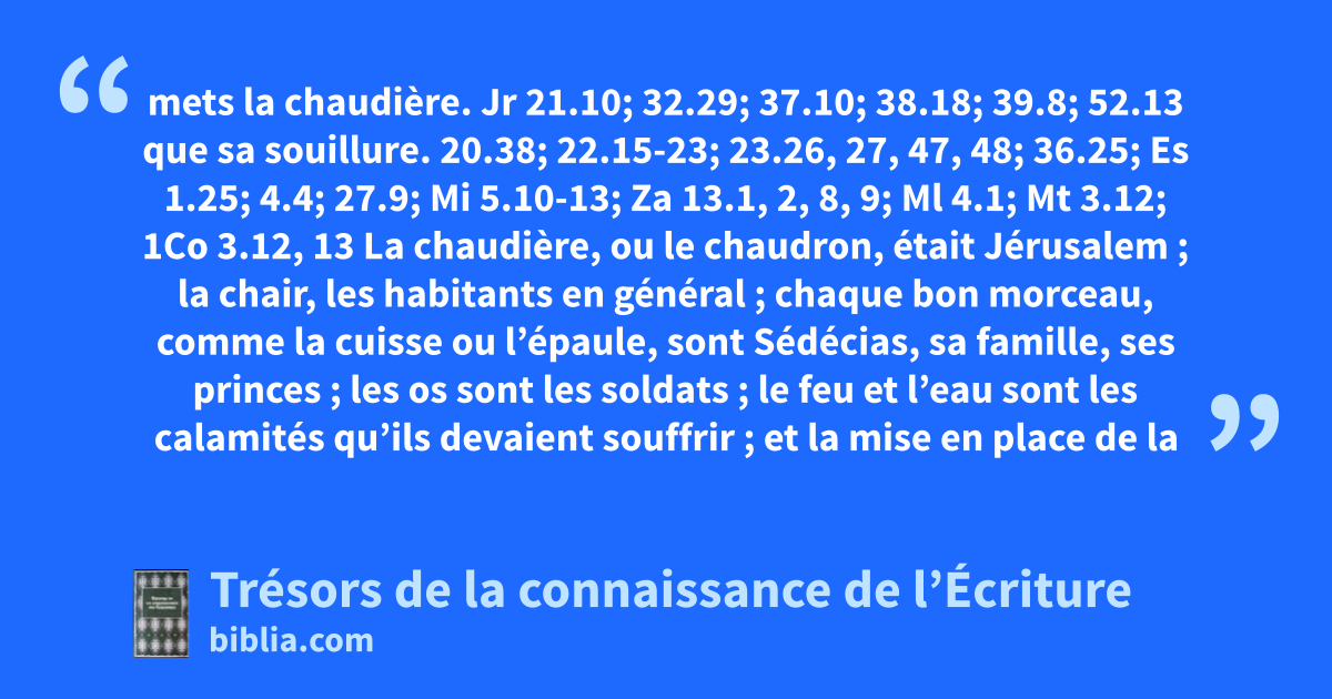 mets la chaudière. Jr 21.10; 32.29; 37.10; 38.18; 39.8; 52.13 que sa souillure. 20.38; 22.15-23; 23.26, 27, 47, 48; 36.25; Es 1.25; 4.4; 27.9; Mi 5.10-13; Za 13.1, 2, 8, 9; Ml 4.1; Mt 3.12; 1Co 3.12, 13 La chaudière, ou le chaudron, était Jérusalem ; la chair, les habitants en général ; chaque bon morceau, comme la cuisse ou l’épaule, sont Sédécias, sa famille, ses princes ; les os sont les soldats ; le feu et l’eau sont les calamités qu’ils devaient souffrir ; et la mise en place de la chaudière, le commencement du siège.