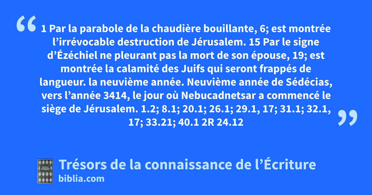 1 Par la parabole de la chaudière bouillante, 6; est montrée l’irrévocable destruction de Jérusalem. 15 Par le signe d’Ézéchiel ne pleurant pas la mort de son épouse, 19; est montrée la calamité des Juifs qui seront frappés de langueur.