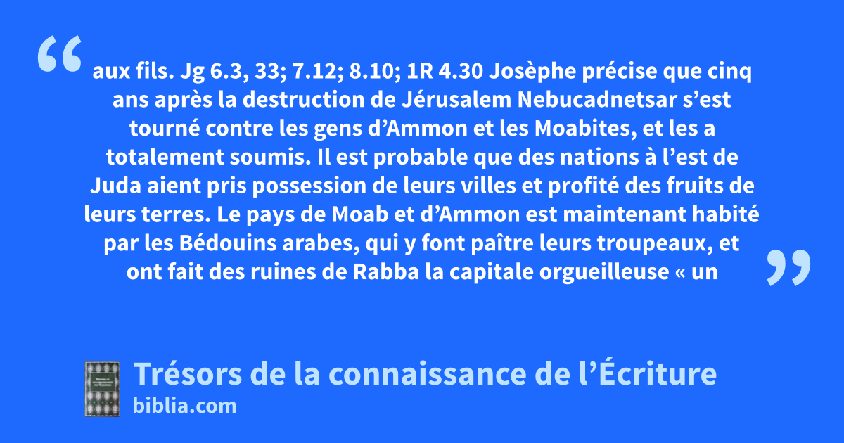aux fils. Jg 6.3, 33; 7.12; 8.10; 1R 4.30 Josèphe précise que cinq ans après la destruction de Jérusalem Nebucadnetsar s’est tourné contre les gens d’Ammon et les Moabites, et les a totalement soumis. Il est probable que des nations à l’est de Juda aient pris possession de leurs villes et profité des fruits de leurs terres. Le pays de Moab et d’Ammon est maintenant habité par les Bédouins arabes, qui y font paître leurs troupeaux, et ont fait des ruines de Rabba la capitale orgueilleuse « un parc pour les chameaux ». Voir 2S 12.26 de l’Orient. Gn 29.1; Nb 23.7; Es 41.2 ils mangeront tes fruits. Lv 26.16; Dt 28.33, 51; Jg 6.3-6; Es 1.7; 32.8, 9; 65.22