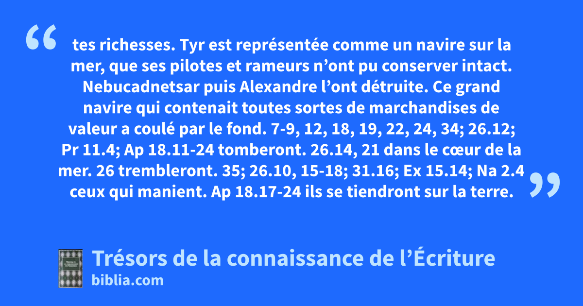 tes richesses. Tyr est représentée comme un navire sur la mer, que ses pilotes et rameurs n’ont pu conserver intact. Nebucadnetsar puis Alexandre l’ont détruite. Ce grand navire qui contenait toutes sortes de marchandises de valeur a coulé par le fond. 7-9, 12, 18, 19, 22, 24, 34; 26.12; Pr 11.4; Ap 18.11-24 tomberont. 26.14, 21 dans le cœur de la mer. 26