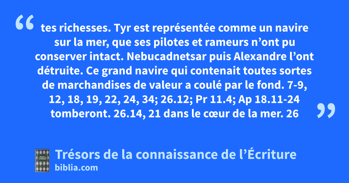 tes richesses. Tyr est représentée comme un navire sur la mer, que ses pilotes et rameurs n’ont pu conserver intact. Nebucadnetsar puis Alexandre l’ont détruite. Ce grand navire qui contenait toutes sortes de marchandises de valeur a coulé par le fond. 7-9, 12, 18, 19, 22, 24, 34; 26.12; Pr 11.4; Ap 18.11-24 tomberont. 26.14, 21 dans le cœur de la mer. 26