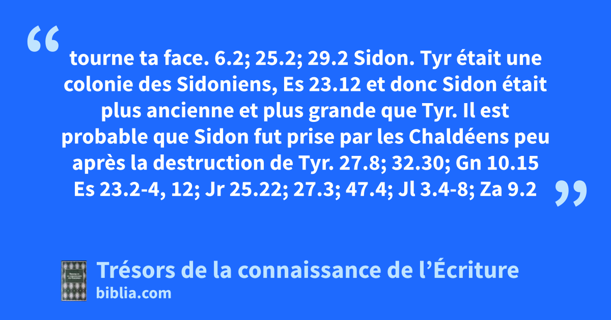 tourne ta face. 6.2; 25.2; 29.2 Sidon. Tyr était une colonie des Sidoniens, Es 23.12 et donc Sidon était plus ancienne et plus grande que Tyr. Il est probable que Sidon fut prise par les Chaldéens peu après la destruction de Tyr. 27.8; 32.30; Gn 10.15 Es 23.2-4, 12; Jr 25.22; 27.3; 47.4; Jl 3.4-8; Za 9.2