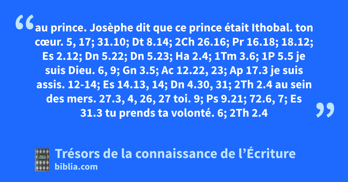 au prince. Josèphe dit que ce prince était Ithobal. ton cœur. 5, 17; 31.10; Dt 8.14; 2Ch 26.16; Pr 16.18; 18.12; Es 2.12; Dn 5.22; Dn 5.23; Ha 2.4; 1Tm 3.6; 1P 5.5 je suis Dieu. 6, 9; Gn 3.5; Ac 12.22, 23; Ap 17.3 je suis assis. 12-14; Es 14.13, 14; Dn 4.30, 31; 2Th 2.4 au sein des mers. 27.3, 4, 26, 27 toi. 9; Ps 9.21; 72.6, 7; Es 31.3 tu prends ta volonté. 6; 2Th 2.4
