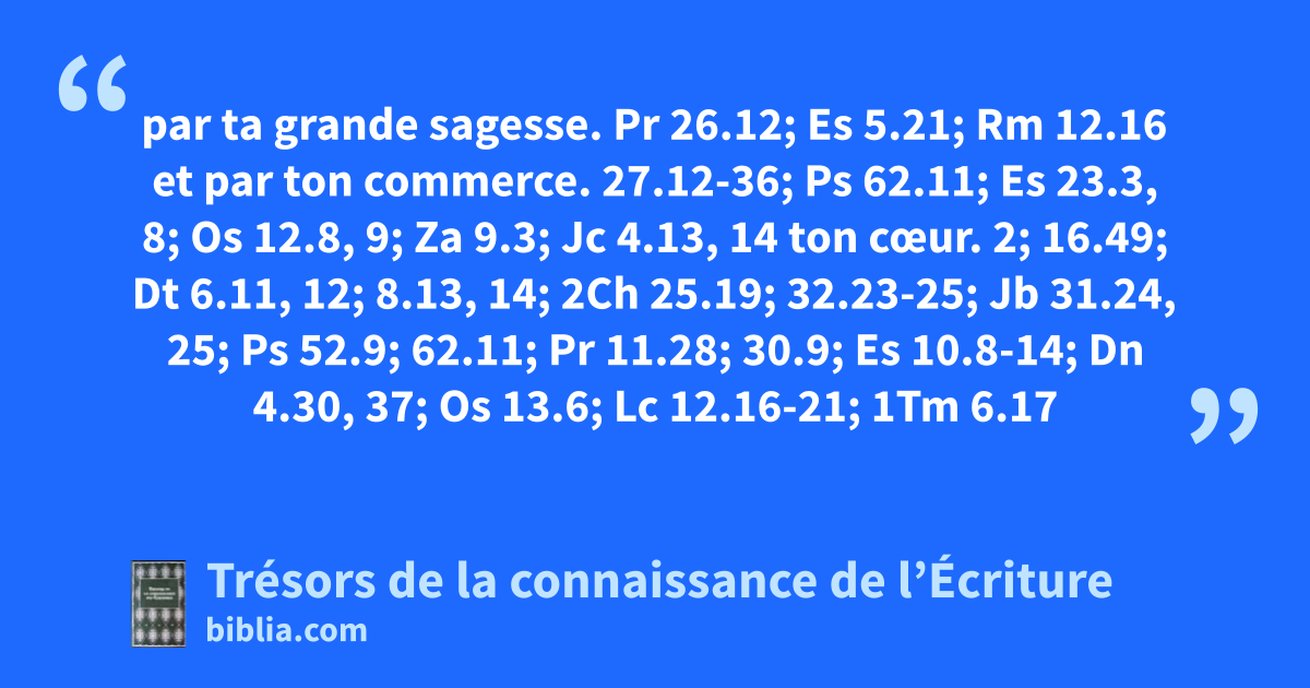 par ta grande sagesse. Pr 26.12; Es 5.21; Rm 12.16 et par ton commerce. 27.12-36; Ps 62.11; Es 23.3, 8; Os 12.8, 9; Za 9.3; Jc 4.13, 14 ton cœur. 2; 16.49; Dt 6.11, 12; 8.13, 14; 2Ch 25.19; 32.23-25; Jb 31.24, 25; Ps 52.9; 62.11; Pr 11.28; 30.9; Es 10.8-14; Dn 4.30, 37; Os 13.6; Lc 12.16-21; 1Tm 6.17