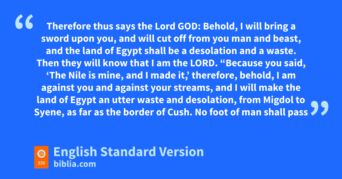 z“Because you3 said, ‘The Nile is mine, and I made it,’ 10 therefore, zbehold, I am against you and aagainst your streams, and aI will make the land of Egypt an utter waste and desolation, bfrom Migdol to Syene, as far as the border of Cush. 11 cNo foot of man shall pass through it, and no foot of beast shall pass through it; it shall be uninhabited forty years. 12 dAnd I will make the land of Egypt a desolation in the midst of desolated countries, and her cities shall be a desolation forty years among cities that are laid waste. eI will scatter the Egyptians among the nations, and disperse them through the countries.