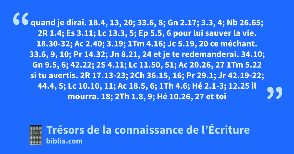 quand je dirai. 18.4, 13, 20; 33.6, 8; Gn 2.17; 3.3, 4; Nb 26.65; 2R 1.4; Es 3.11; Lc 13.3, 5; Ep 5.5, 6 pour lui sauver la vie. 18.30-32; Ac 2.40; 3.19; 1Tm 4.16; Jc 5.19, 20 ce méchant. 33.6, 9, 10; Pr 14.32; Jn 8.21, 24 et je te redemanderai. 34.10; Gn 9.5, 6; 42.22; 2S 4.11; Lc 11.50, 51; Ac 20.26, 27 1Tm 5.22