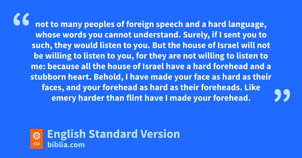 4 And he said to me, w“Son of man, go to the house of Israel and speak with my words to them. 5 For you are not sent to a people of foreign speech and a hard language, but to the house of Israel— 6 not to many peoples of foreign speech and a hard language, whose words you cannot understand. xSurely, if I sent you to such, they would listen to you. 7 yBut the house of Israel will not be willing to listen to you, for they are not willing to listen to me: because all the house of Israel zhave a hard forehead and a stubborn heart. 8 aBehold, I have made your face as hard as their faces, and your forehead as hard as their foreheads. 9 Like bemery harder than flint have I made your forehead. cFear them not, nor be dismayed at their looks, for they are a rebellious house.” 10 Moreover, he said to me, “Son of man, dall my words that I shall speak to you receive ein your heart, and hear with your ears. 11 And go to the exiles, fto your people, and speak to them and say to them, g‘Thus says the Lord God,’ hwhether they hear or refuse to hear.”