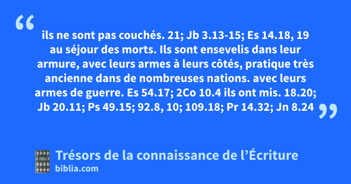 ils ne sont pas couchés. 21; Jb 3.13-15; Es 14.18, 19 au séjour des morts. Ils sont ensevelis dans leur armure, avec leurs armes à leurs côtés, pratique très ancienne dans de nombreuses nations. avec leurs armes de guerre. Es 54.17; 2Co 10.4 ils ont mis. 18.20; Jb 20.11; Ps 49.15; 92.8, 10; 109.18; Pr 14.32; Jn 8.24