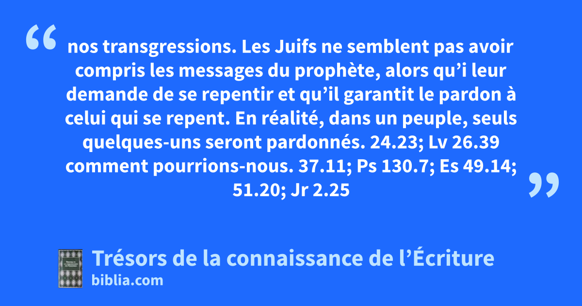 nos transgressions. Les Juifs ne semblent pas avoir compris les messages du prophète, alors qu’i leur demande de se repentir et qu’il garantit le pardon à celui qui se repent. En réalité, dans un peuple, seuls quelques-uns seront pardonnés. 24.23; Lv 26.39 comment pourrions-nous. 37.11; Ps 130.7; Es 49.14; 51.20; Jr 2.25