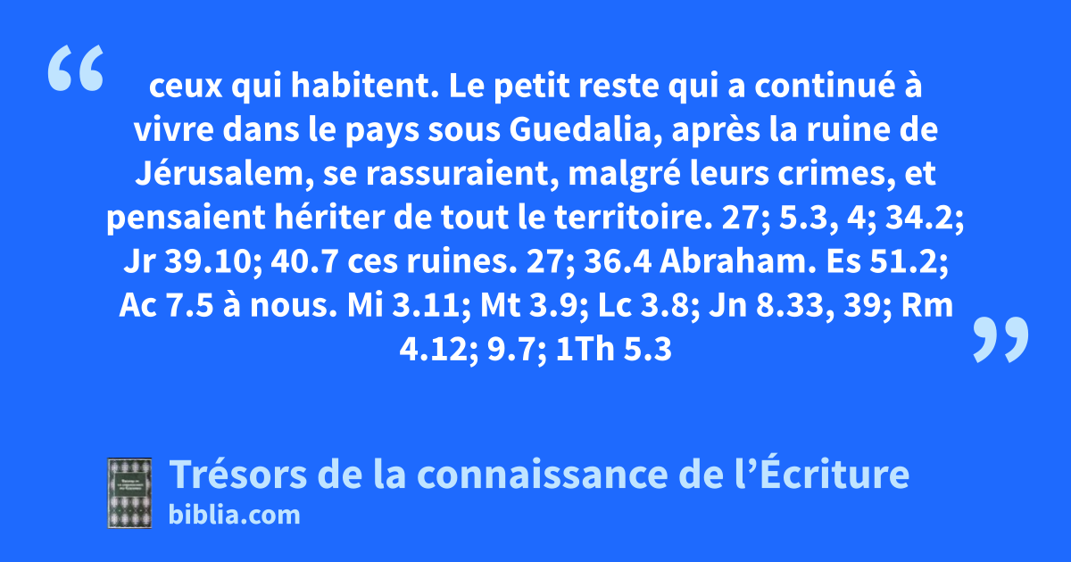 ceux qui habitent. Le petit reste qui a continué à vivre dans le pays sous Guedalia, après la ruine de Jérusalem, se rassuraient, malgré leurs crimes, et pensaient hériter de tout le territoire. 27; 5.3, 4; 34.2; Jr 39.10; 40.7 ces ruines. 27; 36.4 Abraham. Es 51.2; Ac 7.5 à nous. Mi 3.11; Mt 3.9; Lc 3.8; Jn 8.33, 39; Rm 4.12; 9.7; 1Th 5.3