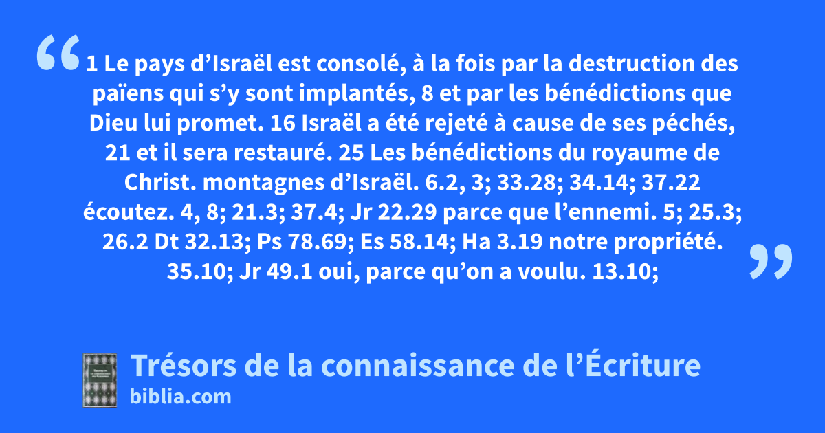 1 Le pays d’Israël est consolé, à la fois par la destruction des païens qui s’y sont implantés, 8 et par les bénédictions que Dieu lui promet. 16 Israël a été rejeté à cause de ses péchés, 21 et il sera restauré. 25 Les bénédictions du royaume de Christ.