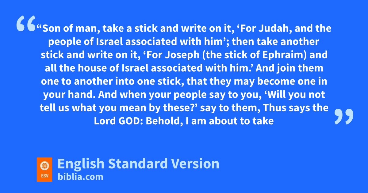 15 The word of the Lord came to me: 16 z“Son of man, atake a stick4 and write on it, ‘For bJudah, and cthe people of Israel associated with him’; then take another stick and write on it, ‘For bJoseph (the stick of dEphraim) and all the house of Israel associated with him.’ 17 And ejoin them one to another into one stick, that fthey may become gone in your hand. 18 And when hyour people say to you, i‘Will you not tell us what you mean by these?’ 19 say to them, Thus says the Lord God: Behold, I am about to take jthe stick of Joseph (that is in the hand of Ephraim) and the tribes of Israel associated with him. And I will join with it the jstick of Judah,5 and kmake them one stick, gthat they may be one in my hand. 20 When the sticks on which you write are in your hand lbefore their eyes, 21 then say to them, Thus says the Lord God: Behold, mI will take the people of Israel from the nations among which they have gone, and will gather them from all around, and mbring them to their own land. 22 And nI will make them one nation in the land, on othe mountains of Israel. And pone king shall be king over them all, and they shall be no longer qtwo nations, and no longer divided into two kingdoms. 23 rThey shall not sdefile themselves anymore twith their idols and their detestable things, or with any of their transgressions. But uI will save them from all the backslidings6 in which they have sinned, and will cleanse them; and vthey shall be my people, and I will be their God.