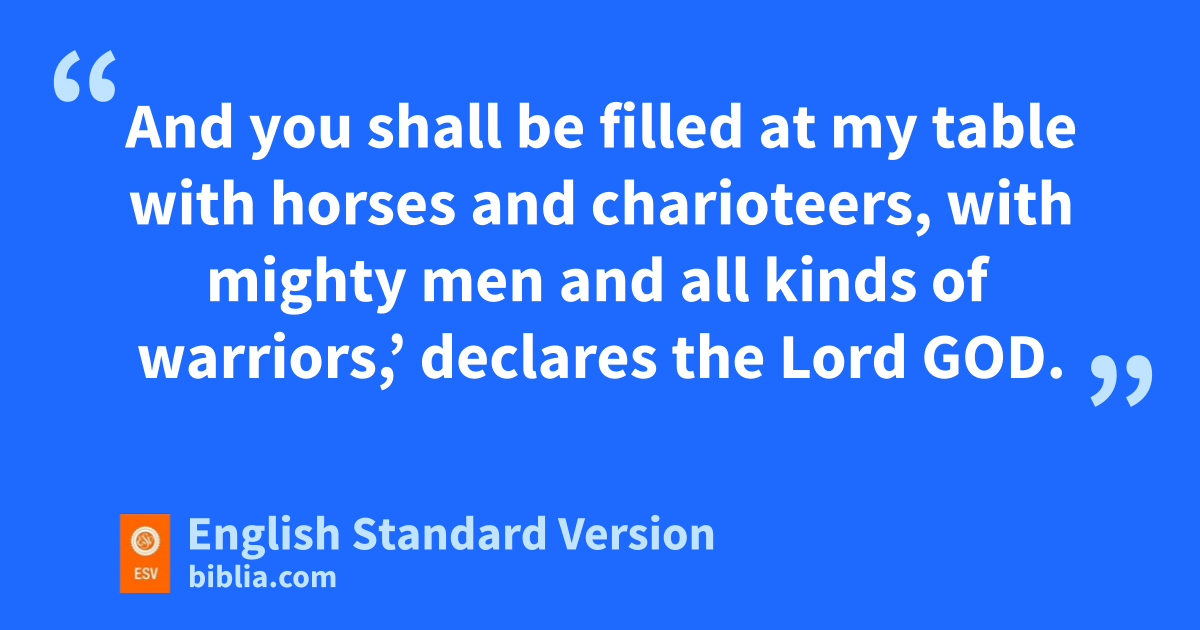 17 “As for you, zson of man, thus says the Lord God: aSpeak to bthe birds of every sort and to ball beasts of the field: ‘Assemble and come, gather from all around to cthe sacrificial feast that I am preparing for you, a great sacrificial feast on the mountains of Israel, and you shall eat flesh and drink blood. 18 dYou shall eat the flesh of the mighty, and drink the blood of the princes of the earth—of rams, of lambs, and of he-goats, of bulls, all of them efat beasts of Bashan. 19 And you shall eat fat till you are filled, and drink blood till you are drunk, at the sacrificial feast that I am preparing for you. 20 And you shall be filled at my table with horses and charioteers, with mighty men and all kinds of warriors,’ declares the Lord God.