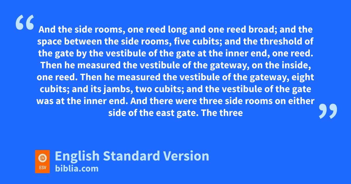 5 And behold, there was ja wall all around the outside of the temple area, and the length of the measuring reed in the man’s hand was six long cubits, keach being a cubit and a handbreadth2 in length. So he measured the thickness of the wall, one reed; and the height, one reed. 6 Then he went into lthe gateway facing east, mgoing up its steps, and measured the threshold of the gate, one reed deep.3 7 And nthe side rooms, one reed long and one reed broad; and the space between the side rooms, five cubits; and the threshold of the gate by the vestibule of the gate at the inner end, one reed. 8 Then he measured the vestibule of the gateway, on the inside, one reed. 9 Then he measured the vestibule of the gateway, eight cubits; oand its jambs, two cubits; and the vestibule of the gate was at the inner end. 10 And there were three side rooms on either side of the east gate. pThe three were of the same size, and the jambs on either side were of the same size. 11 Then he measured the width of the opening of the gateway, ten cubits; and the length of the gateway, thirteen cubits. 12 There was a barrier before the side rooms, one cubit on either side. And the side rooms were six cubits on either side. 13 Then he measured the gate from the ceiling of the one side room to the ceiling of the other, a breadth of twenty-five cubits; the openings faced each other. 14 He measured also qthe vestibule, sixty cubits. And around the vestibule of the gateway was the court.4 15 From the front of the gate at the entrance to the front of the inner vestibule of the gate was fifty cubits. 16 And the gateway had rwindows all around, narrowing inwards toward the side rooms and toward their sjambs, and likewise the vestibule had windows all around inside, and on the jambs were tpalm trees.