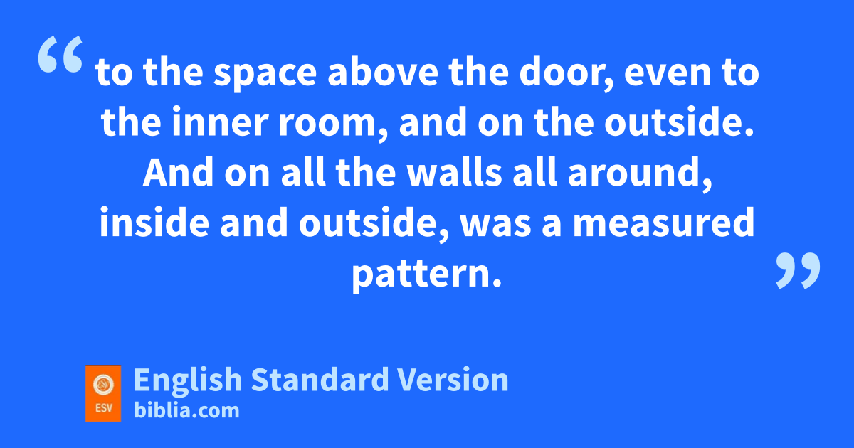 The inside of the nave and the vestibules of the court, 16 ithe thresholds and jthe narrow windows and the galleries all around the three of them, opposite the threshold, were paneled with wood all around, from the floor up to the windows (now the windows were covered), 17 to the space above the door, even to the inner room, and on the outside. And on all the walls all around, inside and outside, was a measured pattern.7 18 It was carved of kcherubim and lpalm trees, a palm tree between cherub and cherub. Every cherub had two faces: 19 ma human face toward the palm tree on the one side, and the face of a young lion toward the palm tree on the other side. They were carved on the whole temple all around. 20 From the floor to above the door, cherubim and palm trees were carved; similarly the wall of the nave.