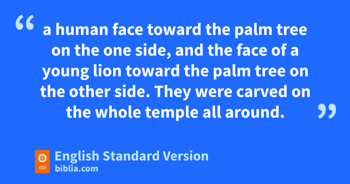The inside of the nave and the vestibules of the court, 16 ithe thresholds and jthe narrow windows and the galleries all around the three of them, opposite the threshold, were paneled with wood all around, from the floor up to the windows (now the windows were covered), 17 to the space above the door, even to the inner room, and on the outside. And on all the walls all around, inside and outside, was a measured pattern.7 18 It was carved of kcherubim and lpalm trees, a palm tree between cherub and cherub. Every cherub had two faces: 19 ma human face toward the palm tree on the one side, and the face of a young lion toward the palm tree on the other side. They were carved on the whole temple all around. 20 From the floor to above the door, cherubim and palm trees were carved; similarly the wall of the nave.