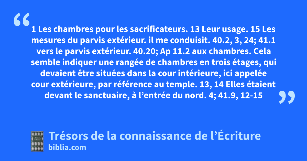 1 Les chambres pour les sacrificateurs. 13 Leur usage. 15 Les mesures du parvis extérieur.