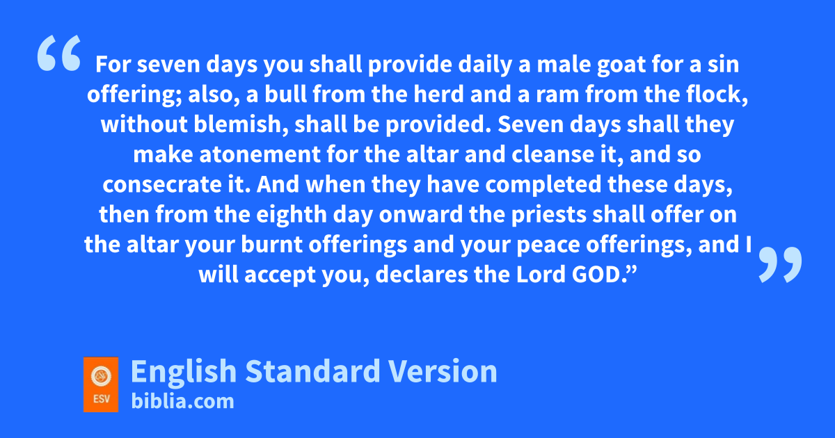 18 And he said to me, h“Son of man, thus says the Lord God: These are the ordinances for the altar: On the day when it is erected for offering burnt offerings upon it and ifor throwing blood against it, 19 you shall give to jthe Levitical priests kof the family of Zadok, who draw near to me to minister to me, declares the Lord God, la bull from the herd for a sin offering. 20 And myou shall take some of its blood and put it on ethe four horns of the altar and on the four corners of the ledge and upon nthe rim all around. oThus you shall purify the altar and make atonement for it. 21 You shall also take the bull of the sin offering, and pit shall be burned in the appointed place belonging to the temple, outside the sacred area. 22 And on the second day you shall offer a male goat without blemish for a sin offering; and the altar shall be purified, as it was purified with the bull. 23 When you have finished opurifying it, you shall offer a bull from the herd without blemish and qa ram from the flock without blemish. 24 You shall present them before the Lord, and the priests rshall sprinkle salt on them and offer them up as a burnt offering to the Lord. 25 sFor seven days you shall provide daily a male goat for a sin offering; also, a bull from the herd and a ram from the flock, without blemish, shall be provided. 26 Seven days shall they make atonement for the altar and cleanse it, and so consecrate it.7 27 And when they have completed these days, then tfrom the eighth day onward the priests shall offer on the altar your burnt offerings and your upeace offerings, and vI will accept you, declares the Lord God.”