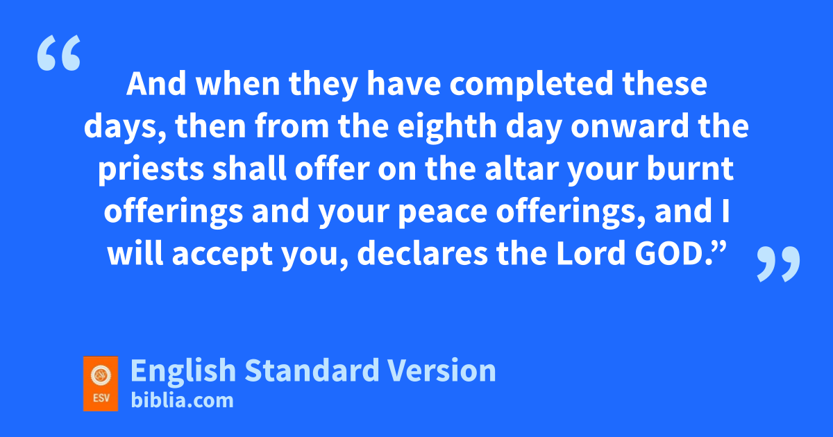 18 And he said to me, h“Son of man, thus says the Lord God: These are the ordinances for the altar: On the day when it is erected for offering burnt offerings upon it and ifor throwing blood against it, 19 you shall give to jthe Levitical priests kof the family of Zadok, who draw near to me to minister to me, declares the Lord God, la bull from the herd for a sin offering. 20 And myou shall take some of its blood and put it on ethe four horns of the altar and on the four corners of the ledge and upon nthe rim all around. oThus you shall purify the altar and make atonement for it. 21 You shall also take the bull of the sin offering, and pit shall be burned in the appointed place belonging to the temple, outside the sacred area. 22 And on the second day you shall offer a male goat without blemish for a sin offering; and the altar shall be purified, as it was purified with the bull. 23 When you have finished opurifying it, you shall offer a bull from the herd without blemish and qa ram from the flock without blemish. 24 You shall present them before the Lord, and the priests rshall sprinkle salt on them and offer them up as a burnt offering to the Lord. 25 sFor seven days you shall provide daily a male goat for a sin offering; also, a bull from the herd and a ram from the flock, without blemish, shall be provided. 26 Seven days shall they make atonement for the altar and cleanse it, and so consecrate it.7 27 And when they have completed these days, then tfrom the eighth day onward the priests shall offer on the altar your burnt offerings and your upeace offerings, and vI will accept you, declares the Lord God.”