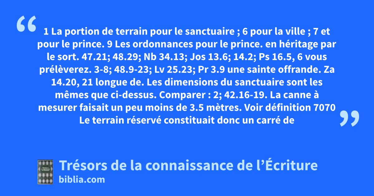 en héritage par le sort. 47.21; 48.29; Nb 34.13; Jos 13.6; 14.2; Ps 16.5, 6 vous prélèverez. 3-8; 48.9-23; Lv 25.23; Pr 3.9 une sainte offrande. Za 14.20, 21 longue de. Les dimensions du sanctuaire sont les mêmes que ci-dessus. Comparer : 2; 42.16-19. La canne à mesurer faisait un peu moins de 3.5 mètres. Voir définition 7070 Le terrain réservé constituait donc un carré de plus de 80 km de côté… Depuis le nord, un secteur d’environ 30 km de large et de 75 à 80 km de long etait réservé pour les sacrificateurs. Au milieu de ce secteur se trouvait l’aire du sanctuaire d’à peu près 2 kmý, close d’un mur, 1, 2. Au sud se trouvait le secteur des Lévites, de la même dimension que celui des sacrificateurs. 5.Au sud de ce secteur se trouvait celui de la ville, de la même longueur que celui des Lévites et des sacrificateurs, mais la largeur en était la moitié. 6 Ces trois secteurs représentaient le carré de 25.000 cannes, donc environ 80 km. Le secteur réservé au prince, de largeur non mentionnée, s’étendait en longueur du nord au sud, le long des côtés est et ouest du carré.