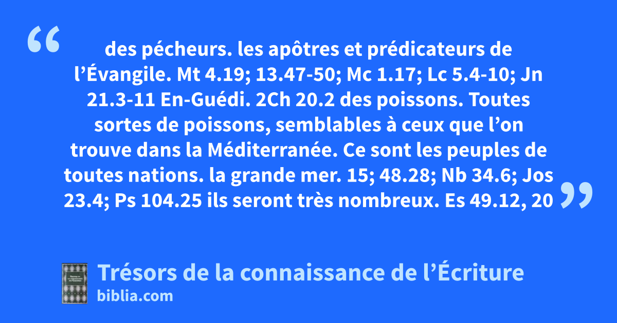 des pécheurs. les apôtres et prédicateurs de l’Évangile. Mt 4.19; 13.47-50; Mc 1.17; Lc 5.4-10; Jn 21.3-11 En-Guédi. 2Ch 20.2 des poissons. Toutes sortes de poissons, semblables à ceux que l’on trouve dans la Méditerranée. Ce sont les peuples de toutes nations. la grande mer. 15; 48.28; Nb 34.6; Jos 23.4; Ps 104.25 ils seront très nombreux. Es 49.12, 20