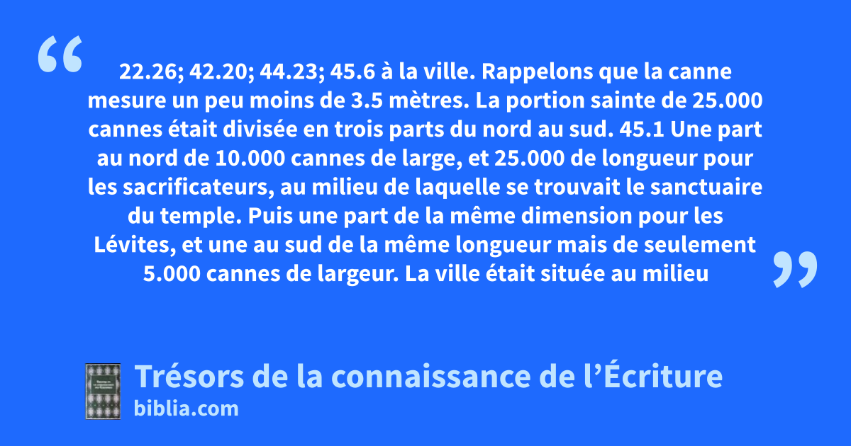 22.26; 42.20; 44.23; 45.6 à la ville. Rappelons que la canne mesure un peu moins de 3.5 mètres. La portion sainte de 25.000 cannes était divisée en trois parts du nord au sud. 45.1 Une part au nord de 10.000 cannes de large, et 25.000 de longueur pour les sacrificateurs, au milieu de laquelle se trouvait le sanctuaire du temple. Puis une part de la même dimension pour les Lévites, et une au sud de la même longueur mais de seulement 5.000 cannes de largeur. La ville était située au milieu de cette portion. Sur les côtés est et ouest de ce carré de 25.000 cannes se trouvait la part du prince. Ce plan parfait indique certainement le territoire d’Emmanuel, la Nouvelle Jérusalem, et son temple, l’Église chrétienne, la maison du Dieu vivant. 1Tm 3.15