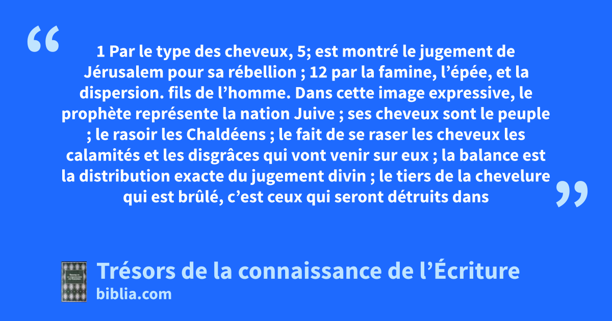 fils de l’homme. Dans cette image expressive, le prophète représente la nation Juive ; ses cheveux sont le peuple ; le rasoir les Chaldéens ; le fait de se raser les cheveux les calamités et les disgrâces qui vont venir sur eux ; la balance est la distribution exacte du jugement divin ; le tiers de la chevelure qui est brûlé, c’est ceux qui seront détruits dans la ville ; le tiers battu par le rasoir représente ceux qui seront tués en tentant de s’échapper ; le tiers dispersé au vent représente ceux qui s’échapperont vers d’autres pays. Les quelques cheveux dans le manteau sont ceux qui restent avec Guedalia ; et le fait qu’ils soient brûlés c’est leur destruction en Égypte. prends. 44.20; Lv 21.5; Es 7.20 prends ensuite une balance. Dn 5.27