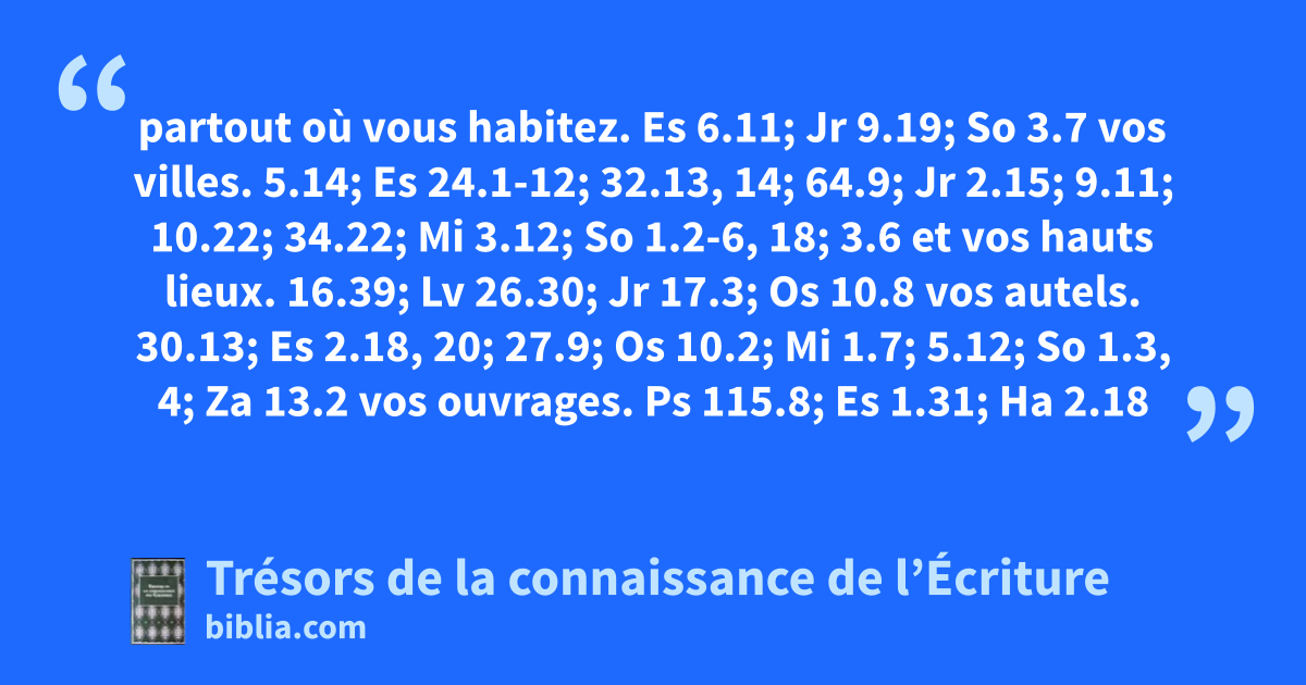 partout où vous habitez. Es 6.11; Jr 9.19; So 3.7 vos villes. 5.14; Es 24.1-12; 32.13, 14; 64.9; Jr 2.15; 9.11; 10.22; 34.22; Mi 3.12; So 1.2-6, 18; 3.6 et vos hauts lieux. 16.39; Lv 26.30; Jr 17.3; Os 10.8 vos autels. 30.13; Es 2.18, 20; 27.9; Os 10.2; Mi 1.7; 5.12; So 1.3, 4; Za 13.2 vos ouvrages. Ps 115.8; Es 1.31; Ha 2.18