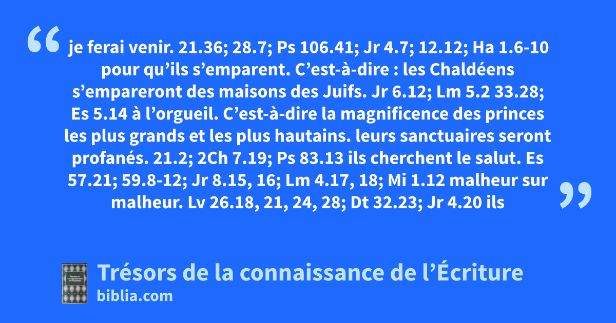 je ferai venir. 21.36; 28.7; Ps 106.41; Jr 4.7; 12.12; Ha 1.6-10 pour qu’ils s’emparent. C’est-à-dire : les Chaldéens s’empareront des maisons des Juifs. Jr 6.12; Lm 5.2 33.28; Es 5.14 à l’orgueil. C’est-à-dire la magnificence des princes les plus grands et les plus hautains. leurs sanctuaires seront profanés. 21.2; 2Ch 7.19; Ps 83.13