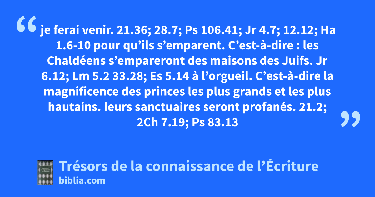 je ferai venir. 21.36; 28.7; Ps 106.41; Jr 4.7; 12.12; Ha 1.6-10 pour qu’ils s’emparent. C’est-à-dire : les Chaldéens s’empareront des maisons des Juifs. Jr 6.12; Lm 5.2 33.28; Es 5.14 à l’orgueil. C’est-à-dire la magnificence des princes les plus grands et les plus hautains. leurs sanctuaires seront profanés. 21.2; 2Ch 7.19; Ps 83.13
