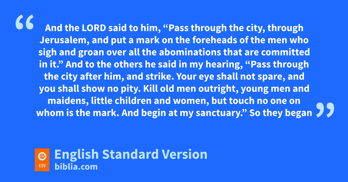 3 Now dthe glory of the God of Israel had gone up from the cherub on which it rested to ethe threshold of the house. And he called to bthe man clothed in linen, who had the writing case at his waist. 4 And the Lord said to him, “Pass through the city, through Jerusalem, and fput a mark on the foreheads of the men who gsigh and groan over all the abominations that are committed in it.” 5 And to hthe others he said in my hearing, “Pass through the city after him, and strike. iYour eye shall not spare, and you shall show no pity. 6 jKill old men outright, young men and maidens, little children and women, but ktouch no one on whom is the mark. And lbegin at my sanctuary.” So they began with the elders who were before the house. 7 Then he said to them, m“Defile the house, and fill the courts with the slain. Go out.” So they went out and struck in the city. 8 And while they were striking, and I was left alone, nI fell upon my face, and cried, o“Ah, Lord God! pWill you destroy all the remnant of Israel qin the outpouring of your wrath on Jerusalem?”