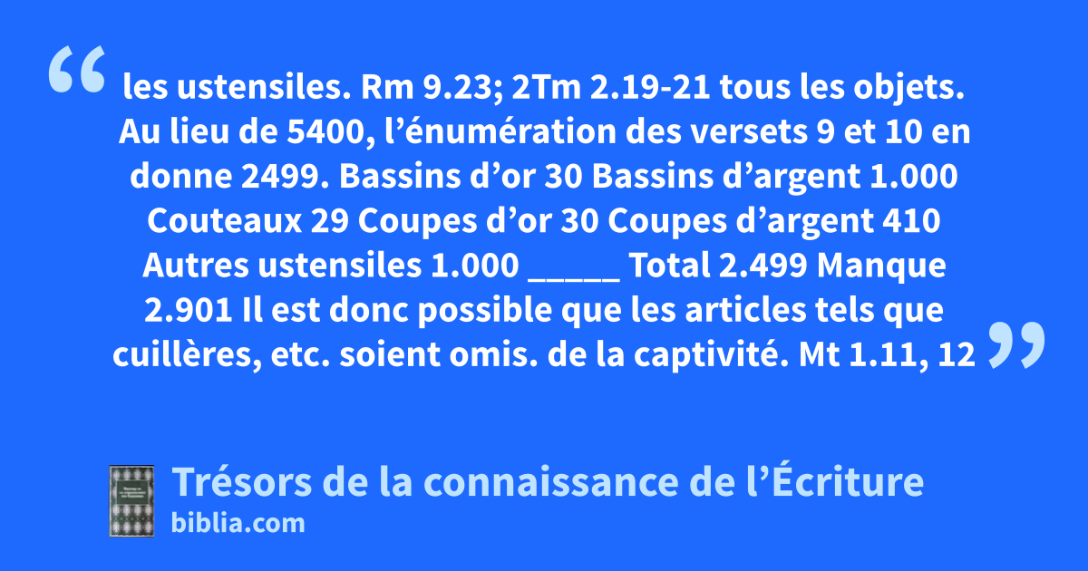 les ustensiles. Rm 9.23; 2Tm 2.19-21 tous les objets. Au lieu de 5400, l’énumération des versets 9 et 10 en donne 2499. Bassins d’or 30 Bassins d’argent 1.000 Couteaux 29 Coupes d’or 30 Coupes d’argent 410 Autres ustensiles 1.000 _____ Total 2.499 Manque 2.901 Il est donc possible que les articles tels que cuillères, etc. soient omis. de la captivité. Mt 1.11, 12