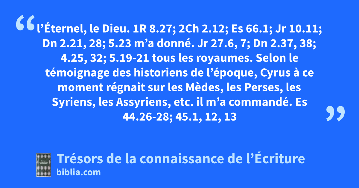 l’Éternel, le Dieu. 1R 8.27; 2Ch 2.12; Es 66.1; Jr 10.11; Dn 2.21, 28; 5.23 m’a donné. Jr 27.6, 7; Dn 2.37, 38; 4.25, 32; 5.19-21 tous les royaumes. Selon le témoignage des historiens de l’époque, Cyrus à ce moment régnait sur les Mèdes, les Perses, les Syriens, les Assyriens, etc. il m’a commandé. Es 44.26-28; 45.1, 12, 13